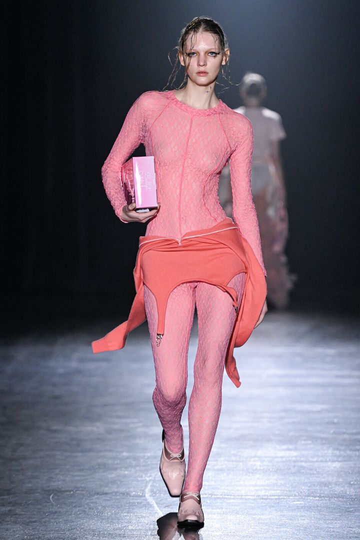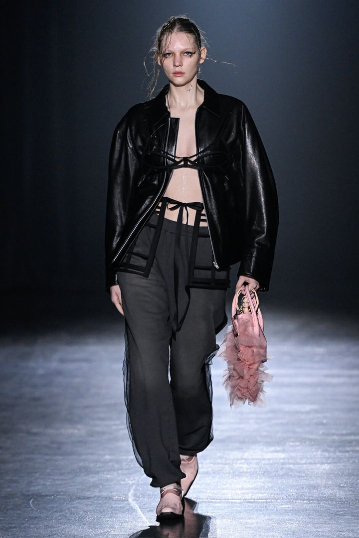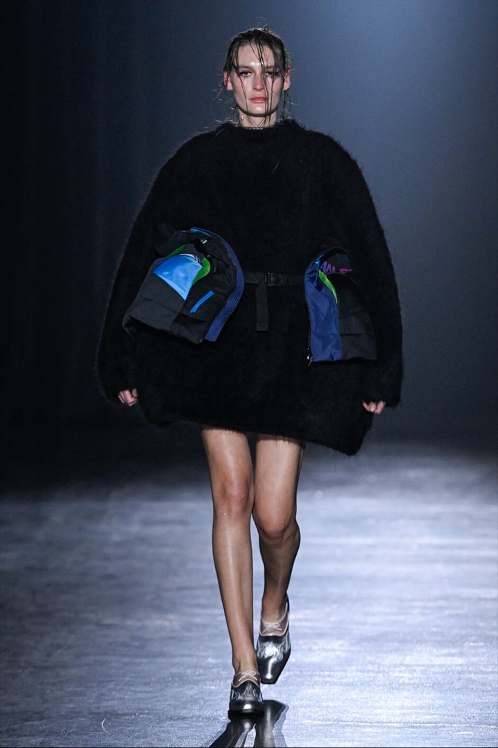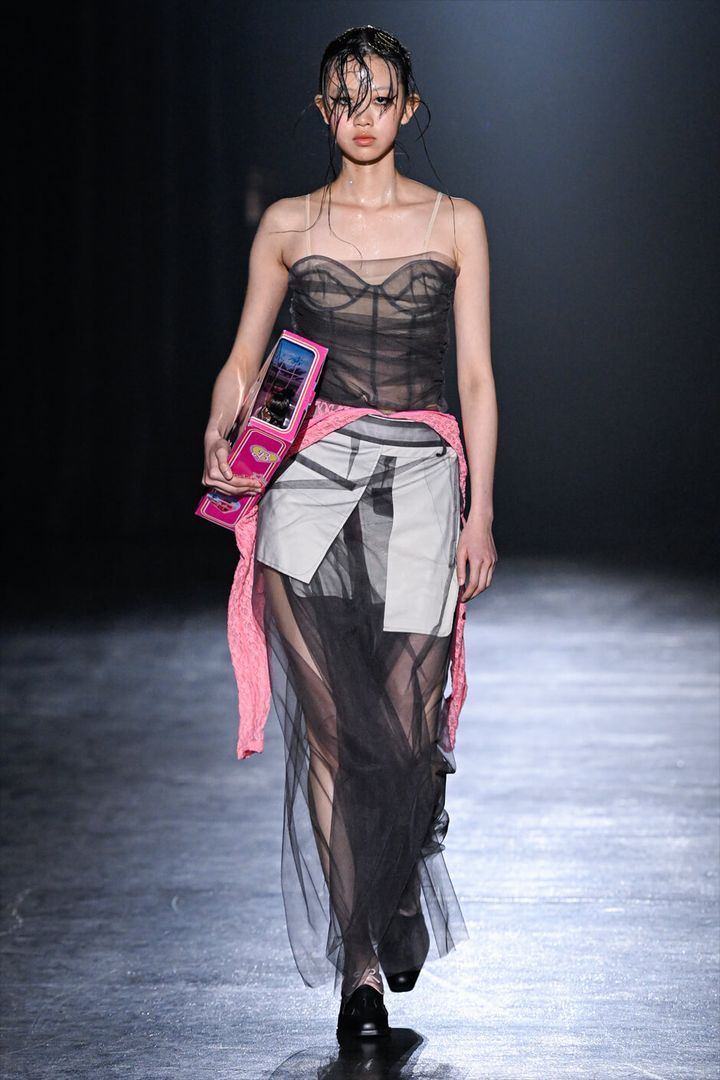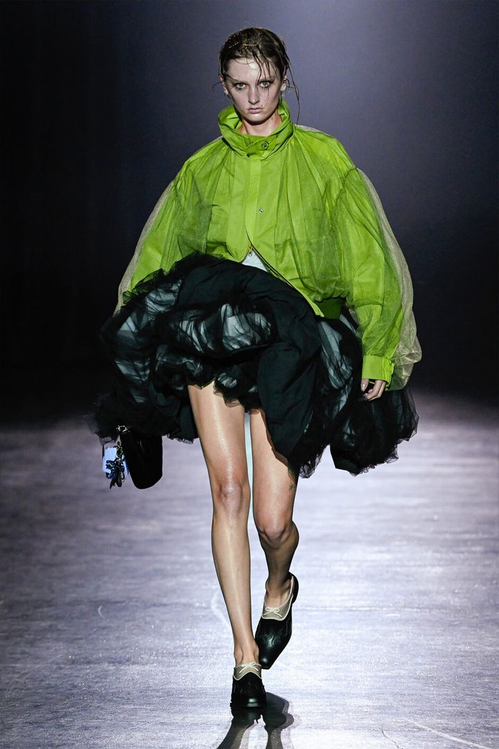 チュールに包まれたナイロンジャケットのルックに始まり、オレンジやパープルなどのネオンカラー、対照的なブラックやネイビー、さまざまな表情のピンクなど、コントラストの効いた色使いがインパクトを残す。