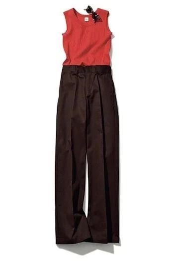 「たとえば発色のいい赤のリブタンク。とくになじみのいいのは、定番色の中でも赤と同じ暖色であるブラウンが効果的。赤など強い色はンピースのように潔く1色で着るか、あるいはタンクやTシャツ、ショートパンツのように肌が出てスタイリング全体に占める面積を少なくするのが上手くまとめるコツ。