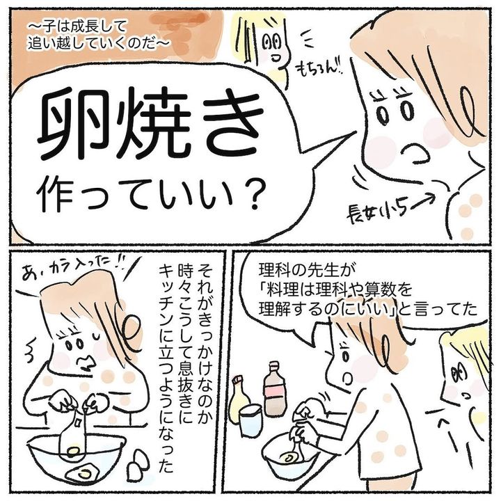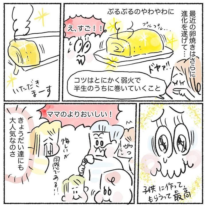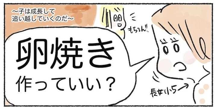 こんにちは!4児の母で漫画家兼公認会計士のAyumiです。子どもは日々大きくなるものですが、先日成長を心の底から実感する出来事がありまして…。長女の卵焼き作りの腕前が、ついに母(ワタシ)を超えたのです!長女いわく、とにかく弱火でじっくり焼き、半生の状態で巻くのが大事とのこと。母、長女の料理人のような大人びた顔に驚愕!うれしくもちょっぴり切ない、子どもの成長記録です♪