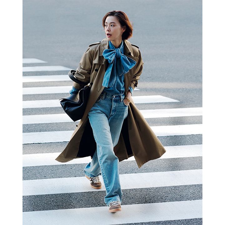 スニーカー[HANDBALL SPEZIAL]¥15,400(アディダス/アディダス ジャパン)トレンチコート¥110,000(ハイク/ボウルズ)ボウタイブラウス¥44,000(ウィム ガゼット/ウィム ガゼット 青山店)デニムパンツ¥17,600(リーバイス®/リーバイ・ストラウス ジャパン)ブレスレット¥95,700(ビジュードエム/ビジュードエム六本木ヒルズ)バッグ[参考価格](COS/COS青山店)
