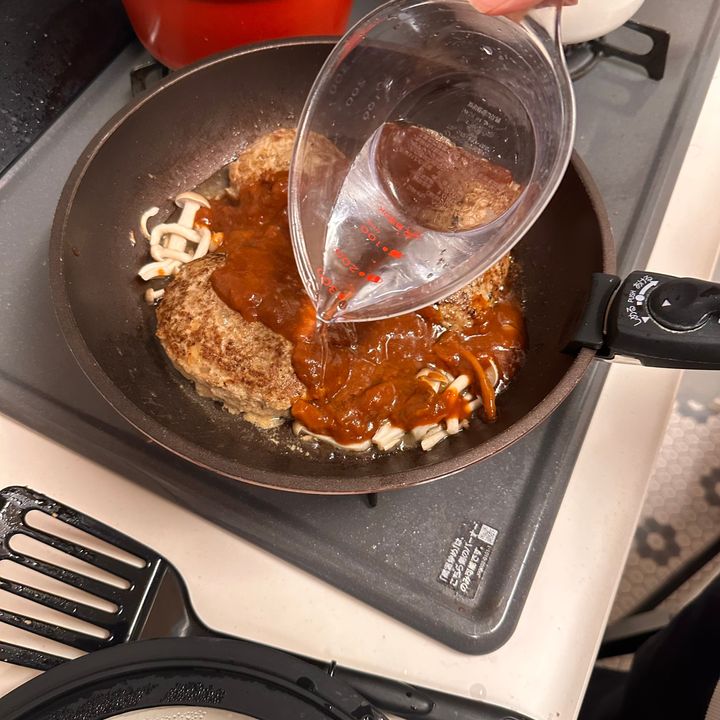 両面に焼き目がつくまで焼き、ソースと水を加えて煮込むだけです^^