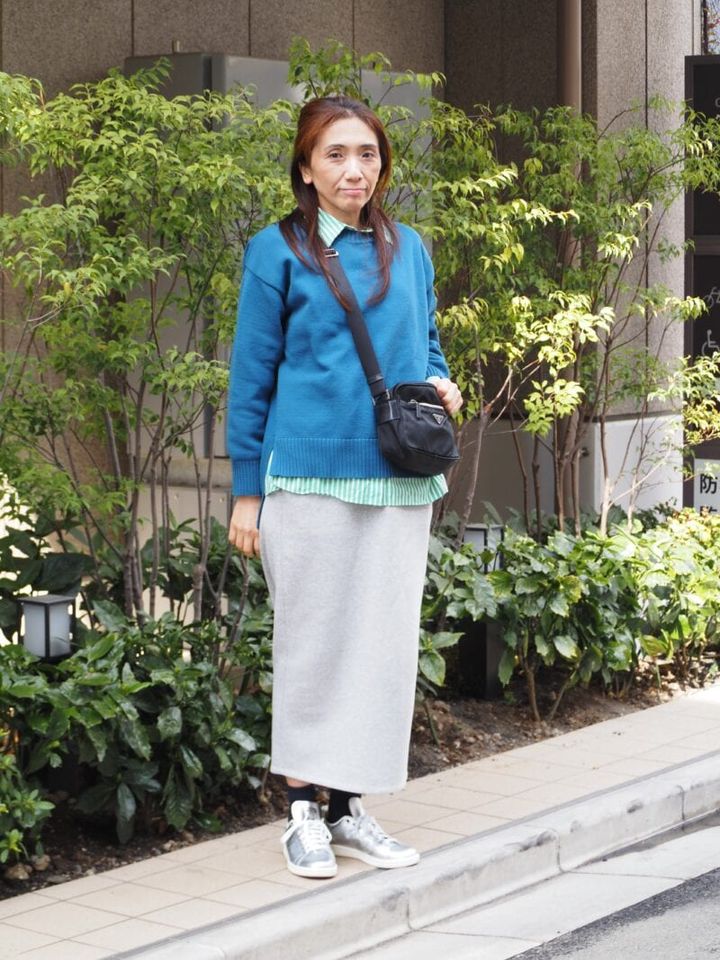 「現在おしゃれの迷走中で、自分に似合う服がピンと来ていません……。その分、サイズ感や丈感は大事にしたく、試着はマストです」。そんな吉長さんが今注目しているのは大人のスポーティスタイル。「自分にとって挑戦的なアイテムはプチプラで試すようにしています」。この日は「ジーユー」で購入したスウェットスカートに、グリーンのシャツときれい色のニットをオン。きちんと感を取り入れたスタイリングに仕上げています。