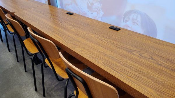 場所は、リバーウォーク北九州シネマ棟1F。広々としたナチュラル&シンプルな店内デザインでゆっくり食事が楽しめます。おひとりさま席から、テーブル席、USB電源があるカウンター席、合わせて83席あって、通路も広々しているから家族連れやベビーカーでもスムーズに出入りができます。