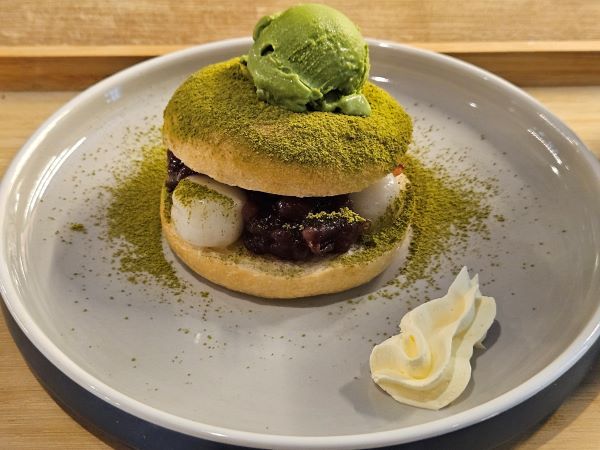 また、国産小麦を使ったベーグルを使ったスイーツも人気です。写真は先日にいただいたスイーツベーグル「白玉抹茶あずき」です。カリッと焼かれたベーグルに、モチモチの白玉とたっぷりの餡、抹茶の風味がとても美味しかったです。和風デザートはとても人気ですね。他には、ホイップがたっぷりのベリーやティラミス風のスイーツベーグルがあります。