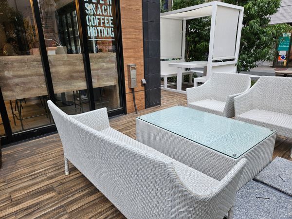 白色を基調としたテラス席も人気です。これからの春夏の季節は、テラス席が気持ち良いですね。毎年、カフェとテラスをつなぐドアをオープンにして「夏祭りイベント」が開催されるなど、宿泊だけでなく全ての来場者が楽しめるイベントも定期的に企画されています。