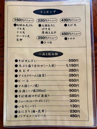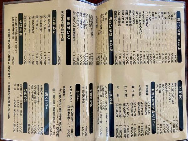 メニューはたくさん。30年前から利用していて、みんなでよく頼んでいたのは「天むすセット」Aセットはたぬきそば Bセットはざるそば。