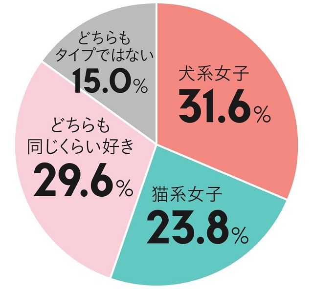 犬系女子が好きと答えた人が31.6%で、猫系女子が好きと答えた23.8%よりもわずかに上回りました。どちらも同じくらい好きと答えた29.6%と合わせると、61.2%の男性が犬系女子を好きということになります。