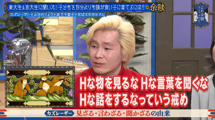 「宮沢賢治なんかはあえてそうしたって言われてますよね。好きな人もいるけど、あえて自ら律して自分の表現の研磨のほうに注いだ」と説明するふかわ。「昔からそれは言われてて」と話を継いだカズレーザーが、「『見ざる・聞かざる・言わざる』ってあるじゃないですか。あれって色んな捉え方があるんですけど、『Hな物を見るな。Hな言葉を聞くな。Hな話をするな』っていう戒めでもあるんです」と話すと、一同は興味津々。