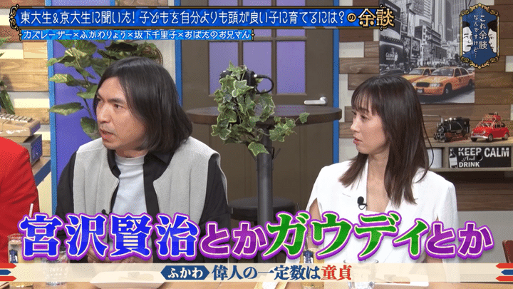 代表例として宮沢賢治やガウディの名前をあげると、カズレーザーも「ニュートンとかもそうです」と補足。ふかわが「私がもし親だったら、偉人になるのであれば童貞でいなさいと(教えます)」と話すと、スタジオに「えー!」「マジで!」と驚く声があがった。
