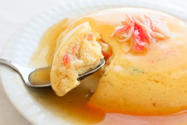 すくってみると、あんの下からふわっふわの豆腐生地がお目見え。中にほぐしたカニ風味かまぼこが入っています♪