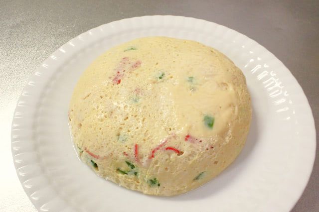 器にお皿を被せてひっくり返して取り出しますが、器が熱くなっているので気を付けて取り出してくださいね。絹ごし豆腐を混ぜたので、白っぽいかに玉に仕上がりました。