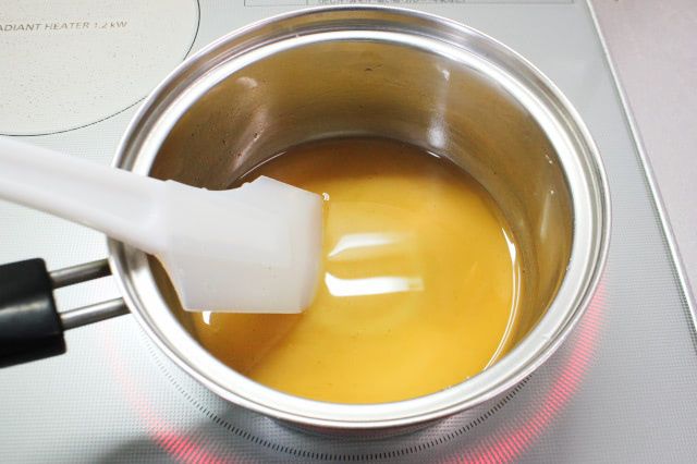 5.小鍋に水、砂糖、しょうゆ、酢、こしょう、片栗粉を入れ、弱火で混ぜながらとろみがつくまで加熱し、鍋肌がふつふつとしたらゴマ油をごく少量加えます。