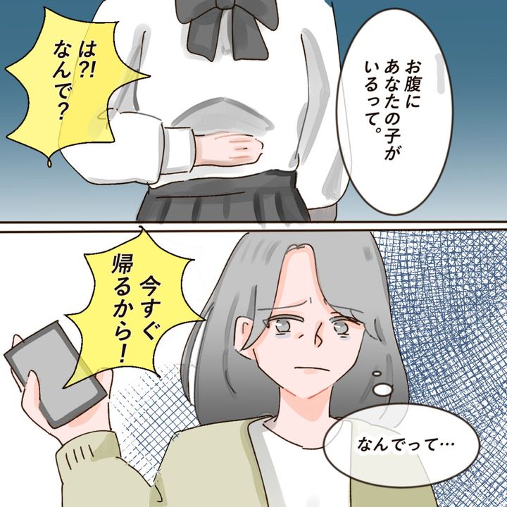 「お腹にあなたの子がいるって」ケイコさんの言葉に、「は!?なんで?」と動揺するサトシさん。ケイコさんは、「なんでって・・」と呆れながら「今すぐ帰るから!」と言う夫の声を聞いていたのでした。