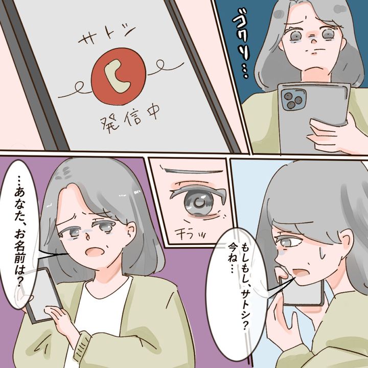 ケイコさんはすぐにサトシさんに電話しました。「もしもし、サトシ?今ね・・」そう言った後で、「・・あなた、お名前は?」と女性にたずねるケイコさん。