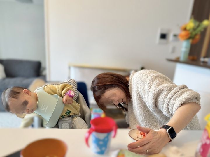 テーブルの下を通るお掃除ロボットの行方を同じ姿勢で一生懸命見つめる、お子さんと祖母。目線はもちろん、体の傾け具合や腕の位置もきれいにシンクロしています。よく見ると、腕につけているスマートウォッチ(赤ちゃんはおもちゃ)も同じ。家族だとしても、ここまで同じ姿勢になるのかと感心してしまいますね。
