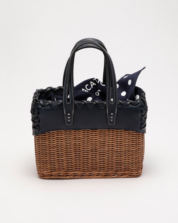 フレンチシックなムード満点のカゴバッグは、ア ヴァケーションの2025年春夏シーズンの新作「RATTAN」シリーズからスモールサイズをリクエスト。ラタンで編まれた四角いボディに施されたレザーはシップスのコーポレートカラーでもあるネイビーにアレンジし、さらに荷物の目隠し用にスカーフがプラスされています。コンパクトながら長財布も入る使い勝手のよいサイズ感が魅力的!
