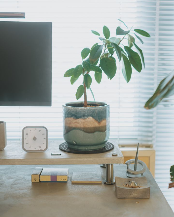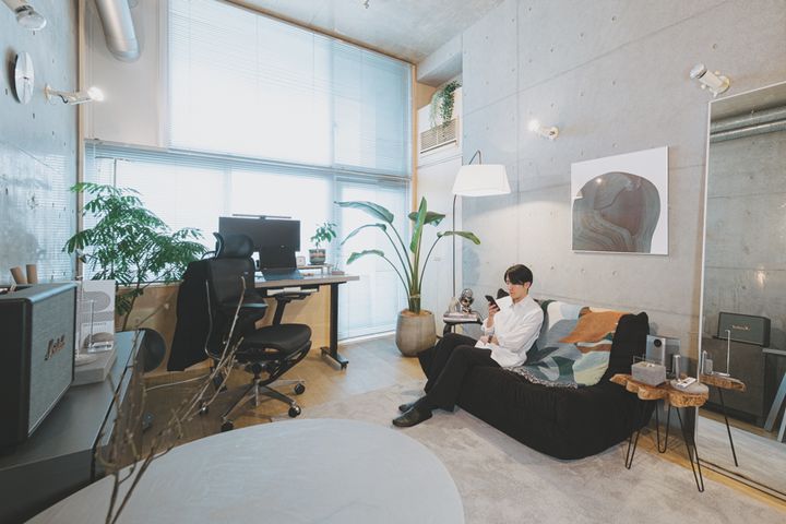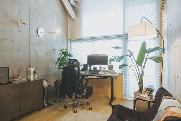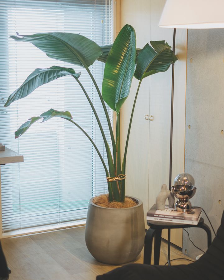 「集中するときはしっかり集中できる空間にすることに加えて、リラックスしたいときにはしっかりリフレッシュできるようにも考えています。窓際のオーガスタは、天井が高いこの物件だからこそ、いいバランスで置くことができる観葉植物です」