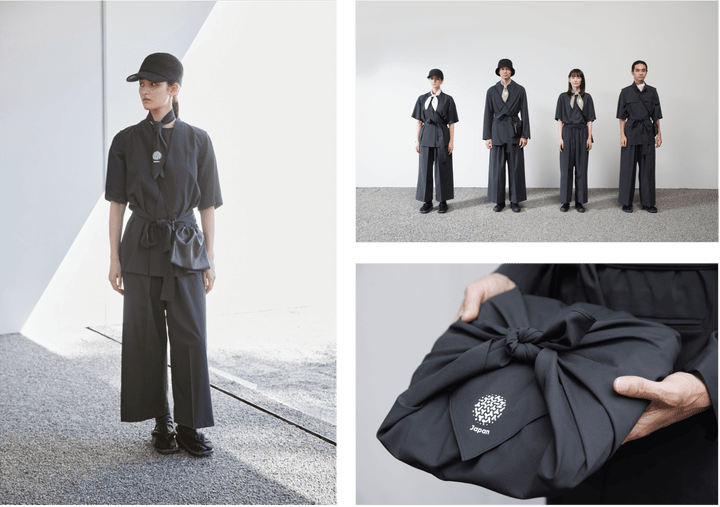 素材には植物由来ポリエステルや再生ペットボトル繊維を使用し、リサイクルしやすいモノマテリアルで設計。会期終了後の再資源化も視野に入れた、サステナブルなユニフォームとなっている。帽子やジャケット、パンツは風呂敷でまとめて持ち運びができ、日本文化の要素も織り込まれている。