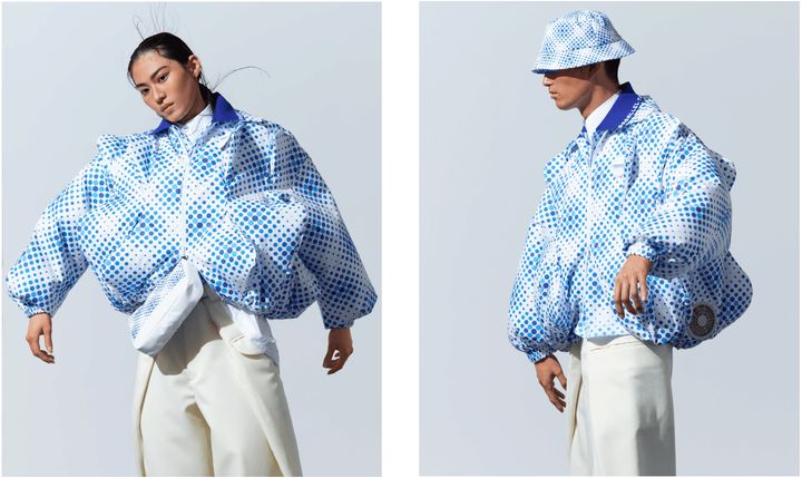通気性と吸水速乾性に優れた素材「AZEK」を採用したアウターは電動ファンを内蔵しており、風を取り込んでシルエットを形成。インナーのポロシャツは、より多くの人がユニセックスに着られるよう、形を追及したという。廃漁網から再生された糸「MURON」を使用した帽子とバッグや、屋内外で色が変わるフォトクロミック素材のロゴバッジもラインナップされる。