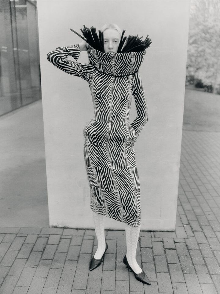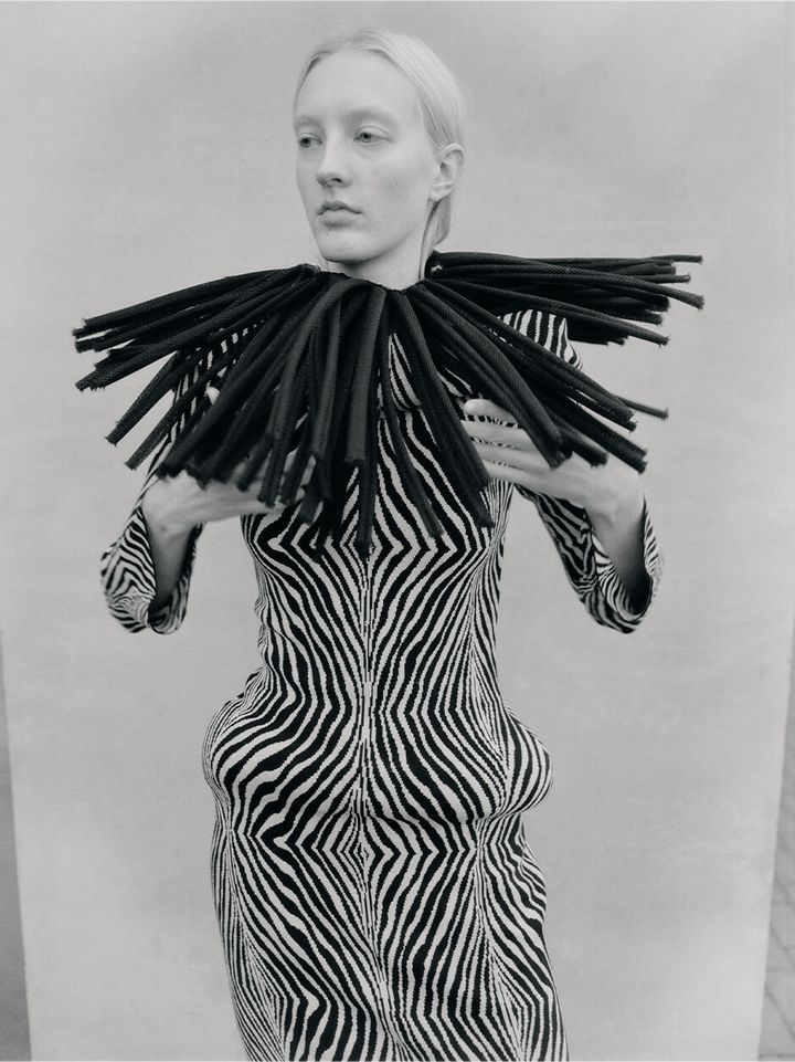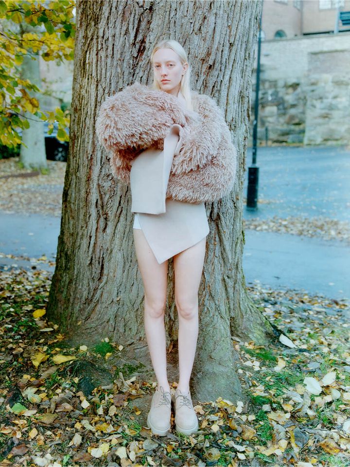 スタイリングはあえて不釣り合いなものにすることで、洗練さと生々しさの間に視覚的な緊張感を生み出しています。