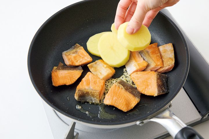 フライパンにサラダ油大さじ1/2を中火で熱し、鮭を並べて焼きつける面を変えながら2分ほど焼く。鮭の色が変わったら、にんにく、じゃがいもを加えてさっと炒め、煮汁の材料を加える。煮立ったらふたをして弱火で10分煮る。バター20gを加えて混ぜ、器に盛ってパセリをふる。