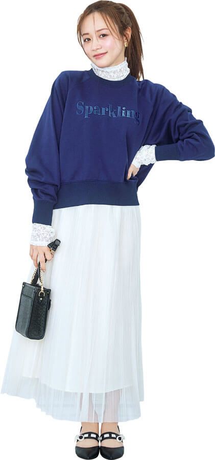 「カジュアルなロゴ入りスウェットは、手抜きコーデに見えないように軽やかなチュールフレアやレースインナーでメリハリを」