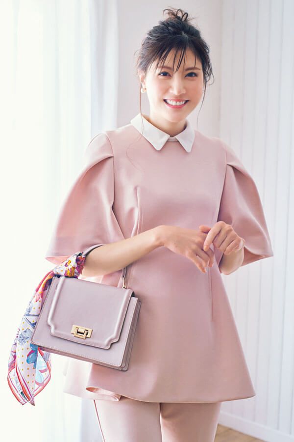 洋服&小物のピンクワントーンで楽しめるのは春の特権。バッグに添えたスカーフがコーデを大人っぽく引き締めます。