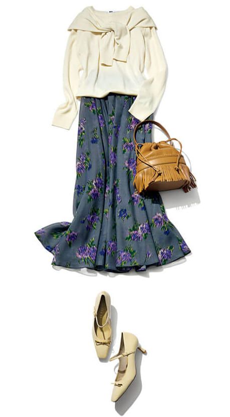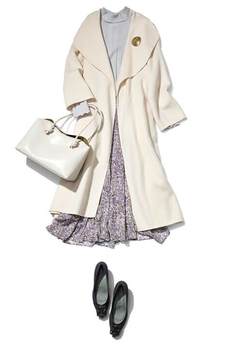 まろやかな色合いでまとめたアウタールックに、ロマンティックな花柄を差して春らしいリズムに。
