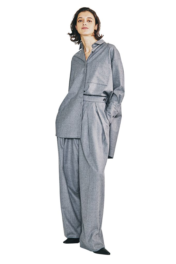 何かと使えるゆったりとしたシャツ+ハイウエストのワイドパンツ。セットで着るのはもちろんのこと、単品使用でも重宝。シャツはヒップが隠れる長めの丈感で、羽織モノとして、またミニボトムや細身のボトムとも好相性。パンツはウエストのもたつきを回避するサイドボタンと、縦落ち感をアシストする深めのタックが脚をキレイに見せてくれる。 ウールシャツ、ワイドパンツ/ともにSACRA(インターリブ)