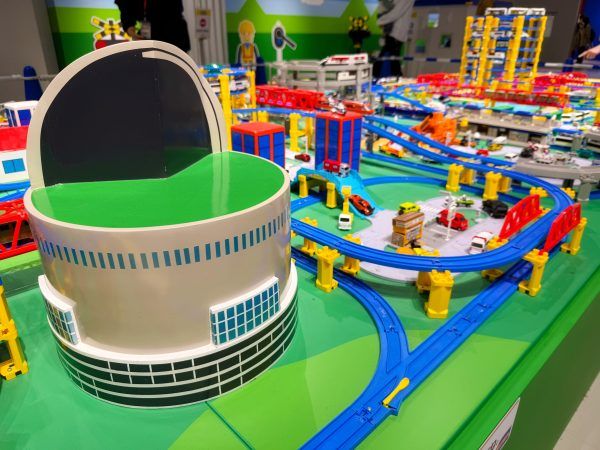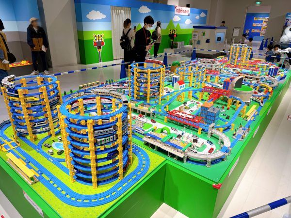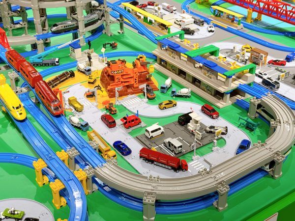 このイベントの目玉のひとつが、トミカ・プラレールの世界が広がる巨大なジオラマ展示です。トミカの車が配置され、精巧に作られた街並みの中をプラレールの列車が軽快に走ります。