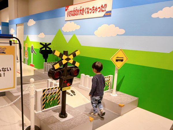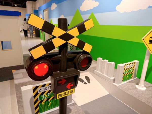 人が通ると感知して音が鳴り出します。踏切ランプが光る様子は本物さながらです!