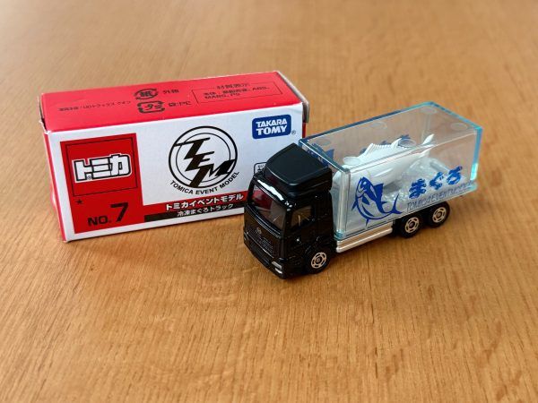 個人的に、やっと出会えた「冷凍まぐろトラック」!トラックの荷台に大きな冷凍まぐろを積んだユニークなデザインです。細部までこだわったリアルな作りに、見た瞬間「これは絶対欲しい!」と心踊りました。昨年販売されましたが、残念ながらトミカ博2024は福岡での開催がなく手にすることができず。ここで出会えたことに感激です!