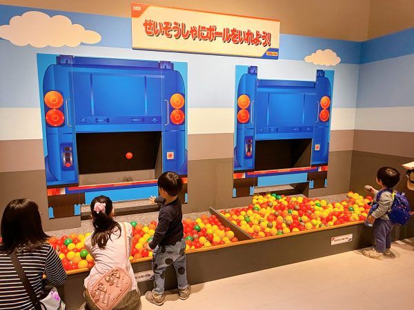 “はたらくくるま”でパトカーや消防車、救急車に次いで人気の「ゴミ収集車・清掃車」。ここではカラフルなボールを入れて遊ぶことができますよ♪小さい子たちが夢中になって投げ入れていました!