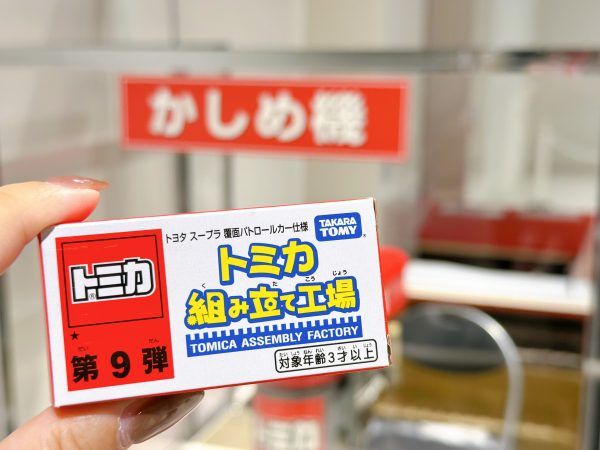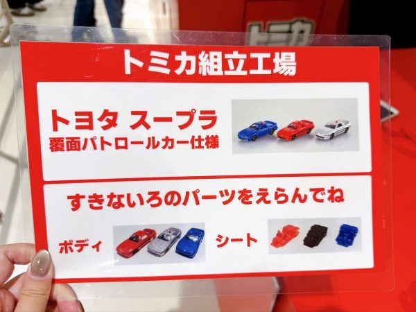 自分で好きな色のパーツを選び、オリジナルのトミカを作ることができます。今回は「第9弾  トヨタ スープラ 覆面パトロールカー仕様」。パーツを選んだら「カシメマン」が組み立ててくれます。
