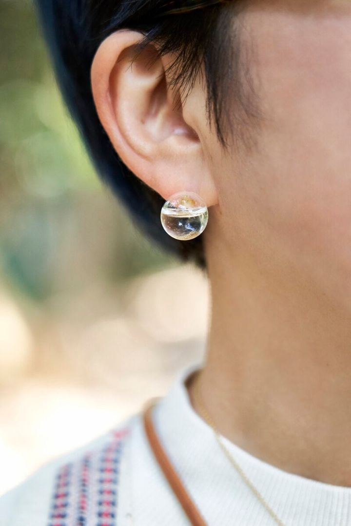 増田さんのピアスコレクションの中でも、目をひくのがこのダブルフェイスのピアス。「前サイドにはオイルが入った球形のクリアガラスがついていて、後ろサイドにはパールがついたデザインです」と増田さん。ブルーのメッシュが入ったショートヘアと相まってさわやかです。