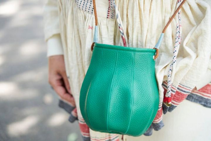ポシェットは10枚の革を縫い合わせた、ころんとしたフォルムが愛らしく、中底の丸いタグもキュート。「アッシュのアイテムは、職人のクリエイション。キーホルダーなどいろんな小物が揃っていて、パリ本店にだけコーナーがあります」(増田さん)