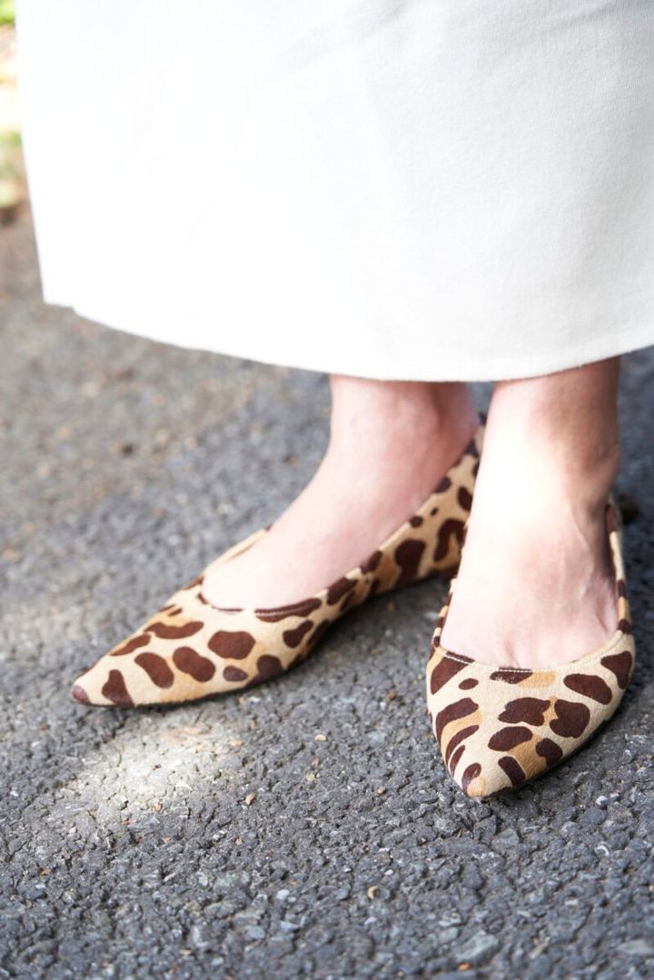 白系のコーデに足元は何を合わせたらいいか、迷うところ。バッグのグリーンと同系色でまとめるのもアリですが、エルメスのグリーンが印象的なので足元には肌なじみのいいレオパ柄を選びました。「ベージュトーンのレオパ柄は、素肌となじむので品よく見えます」(増田さん)