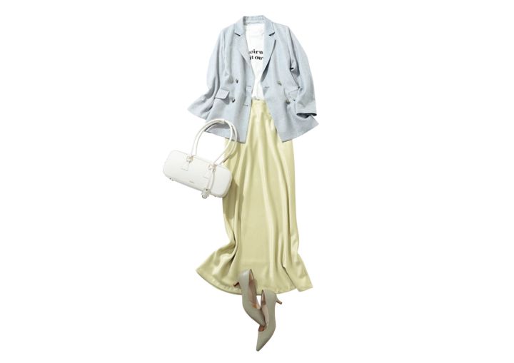 テーラードジャケット¥27,500、サテンナロースカート¥17,600/ともにマイストラーダ ロゴTシャツ¥4,990/アンフィーロ(オンワード樫山) 横長ハンドバッグ¥13,200/ノエラ ミドルヒールパンプス¥7,700/オリエンタルトラフィック(ダブルエー)