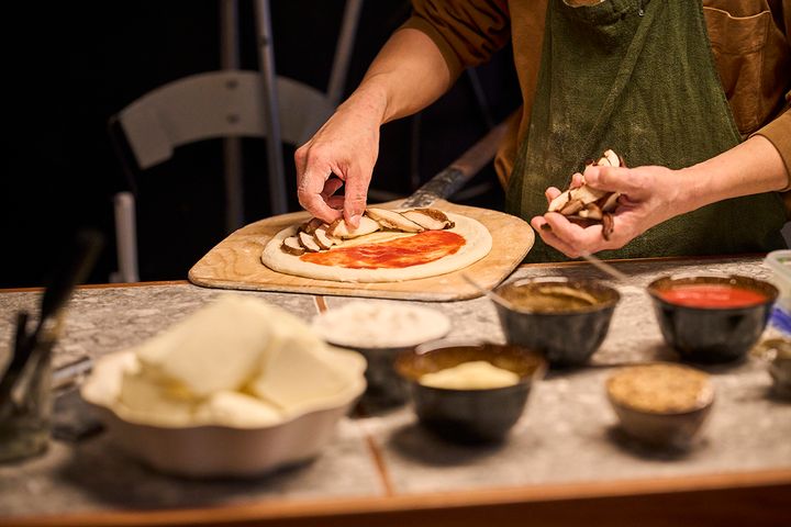 料理に合わせたナチュールワインや国内のクラフトビールなども豊富に取り揃えていて、新宿ゴールデン街でレモンサワーやシロップを販売している「OPEN BOOK(おーぷん ぶっく)」とコラボレーションしたレモンチェッロで作るレモンサワーも人気。ピザ生地にたっぷりと具がのっていく様子を見ながら、好きなお酒を味わうひとときに酔いしれて。