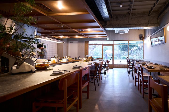 店の内装は、人気の飲食店やホテルなどの空間デザインを数多く手がける設計事務所「SAWS inc.」によるもの。もとは駐車場であったという物件の無機質な魅力を生かしつつも、木の温もりを感じられるモダンな空間に仕上がりました。身を置いているだけで心地よく、気持ちがおだやかに。平日は夜のみの営業ですが、土・日曜、祝日はランチタイムの営業もしています。
