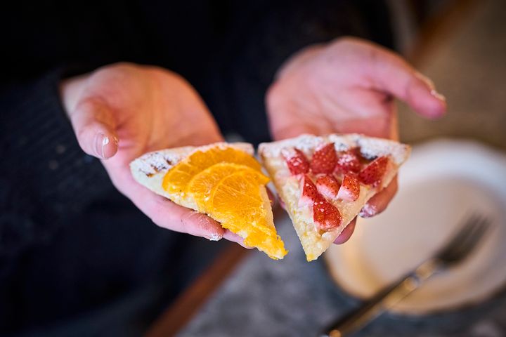 イチゴの甘酸っぱさとピザの薄い生地が絶妙なハーモニーを奏でる「イチゴ」と、酸味がフレッシュに口のなかに広がる「オレンジ」。2種類を一度に味わえるって、やっぱりこのうえない幸せです。みずみずしいフルーツとクリスピーなピザ生地の対比がたまりません。温かいフルーツって、おいしい。やみつきになりそうです。