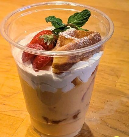 こちらは友人が頼んだトライフル。最近耳にしませんか⁈写真のトライフルをよく見ると、いちごの隣にはまるで指定席のようにワッフルまであります。どんなおいしさだったのか…実はこれ、私がお店を後にしてから注文したそうで(泣)知らなければ気にならないもののその友人ったらインスタにアップして…(笑)