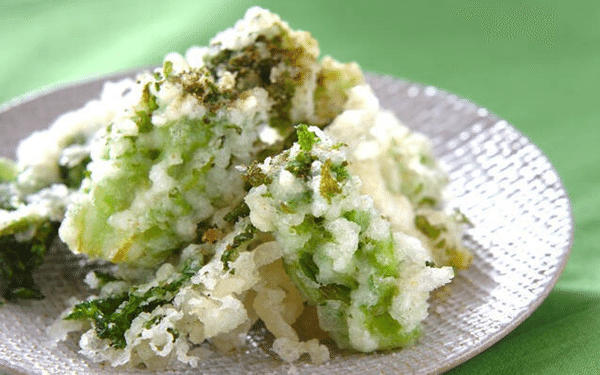 揚げ物は食材の苦さを和らげる効果があり、菜の花にはうってつけ! 油はねしやすいので、アクを抜いたあとはしっかりと水気を切りましょう。水と小麦粉を1:1で合わせた衣は、揚げるとサクサクッとした軽やかな食感。やみつきになること間違いなしです。