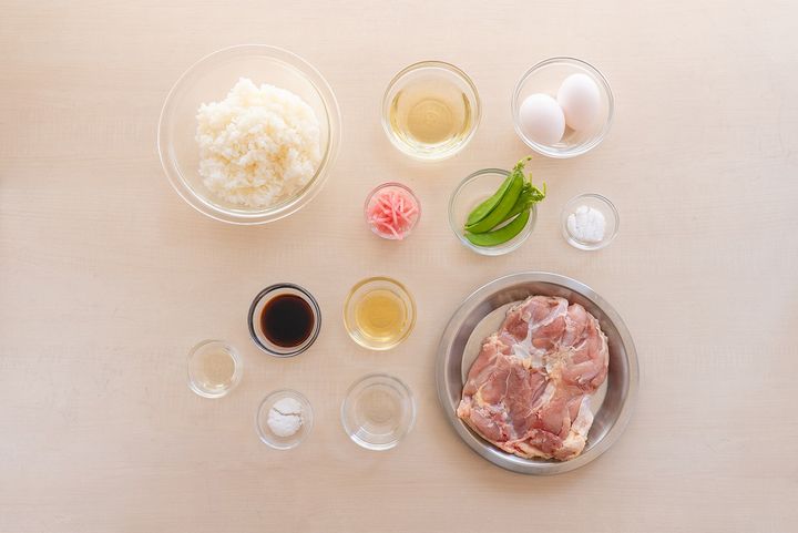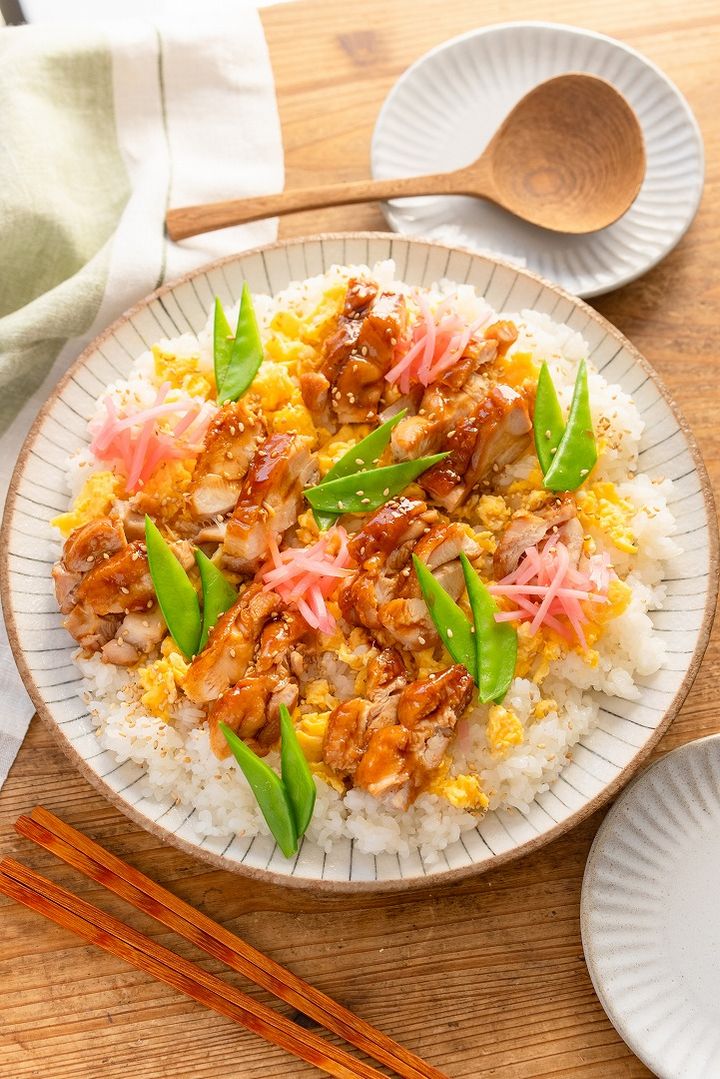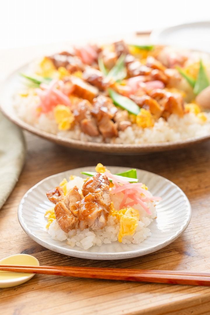 8. 1のすし飯を器に盛り、炒り卵、照り焼きチキンをのせる。