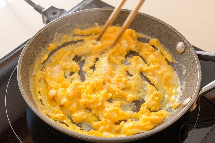 2. 卵を割り、砂糖と塩を加えて混ぜる。フライパンに油(分量外)を薄くひいて弱火にかけ、菜箸で混ぜながら炒り卵を作る。