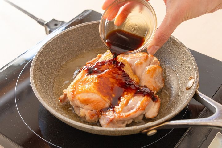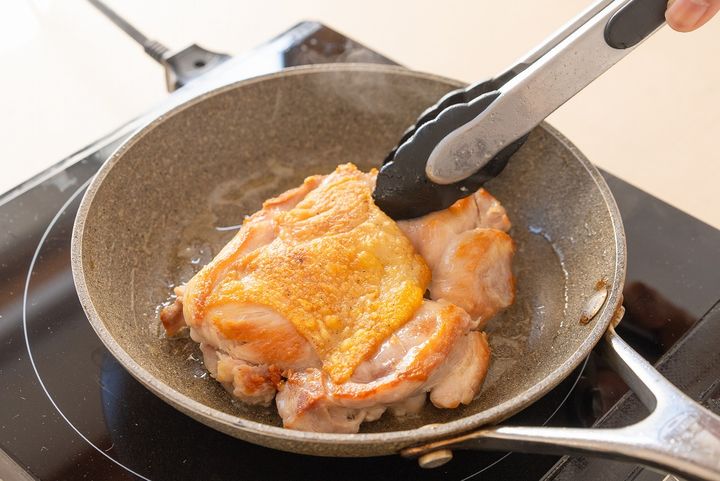 5. フライパンにサラダ油を熱し、鶏肉の皮目を下にして中火で焼く。焼き色がついたら裏返し、フタをして弱火で5分蒸し焼きにする。