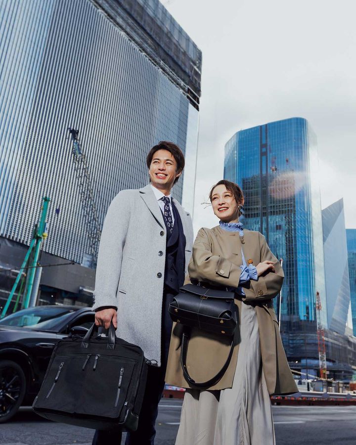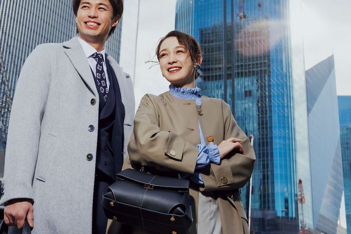 バッグ¥98,000(ポレーヌ カスタマーサービス)イヤリング¥14,300(マージョリー・ベア/ココシュニック新宿タカシマヤ店)【先輩】コート¥106,700(ボブ/タキヒヨー)スーツ¥110,000ベスト¥33,000(ムッシュ ニコル エクストラ〉(ともにニコル プレスルーム)バッグ¥38,500(ホワイタージュ/ホワイタージュ)ほかスタイリスト私物