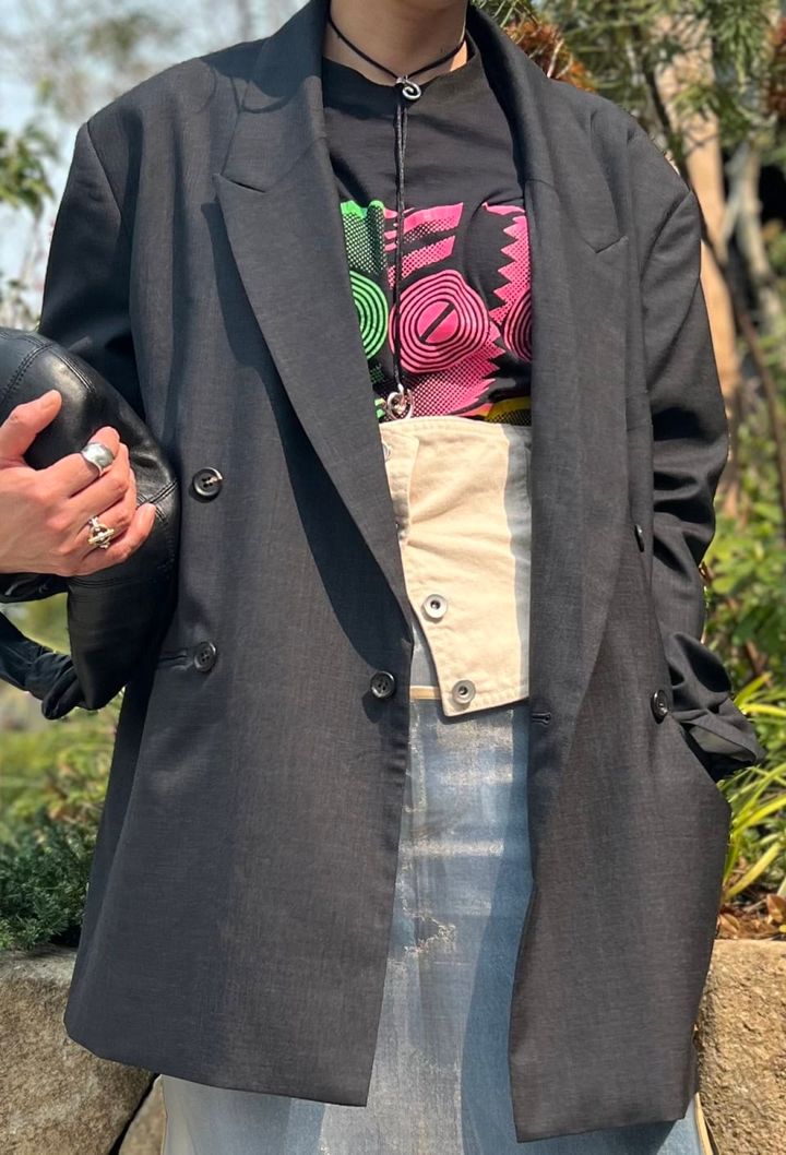 「JUN MIKAMIのサマーウールの素材感が美しい、ハンサムなダブルジャケット。きちんと感のあるジャケットなので、デニムやヴィンテージTシャツと合わせてカジュアルに着くずしています。シンプルになりすぎないよう、メッシュスカートやコルセットを合わせてユニークなアクセントをプラスしたのもポイントです」