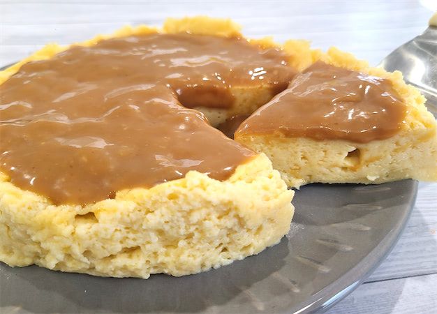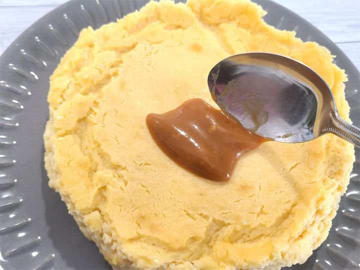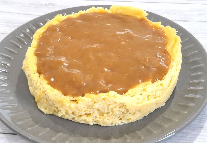 9. 冷やしたプリンチーズケーキを型から取り出し、上にカラメルを乗せたら完成です♪