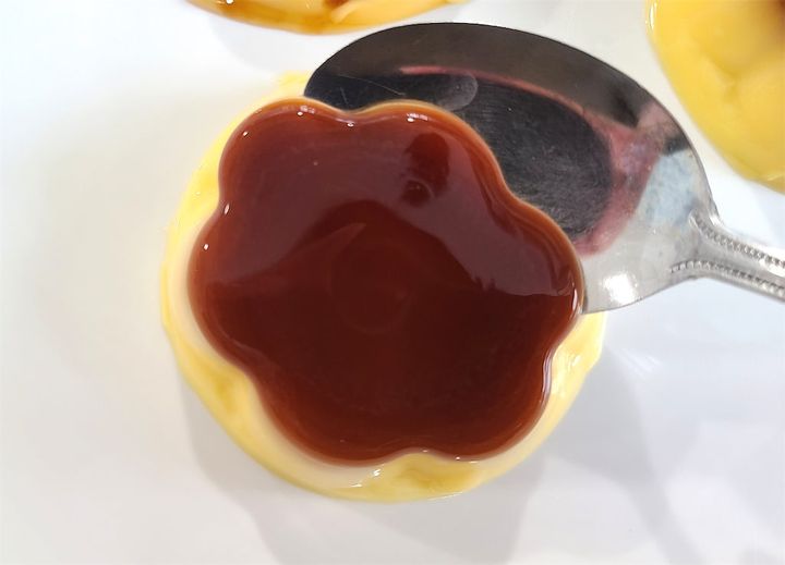 1. プリンを逆さまにしてお皿に出し、上のカラメル部分を取ります。カラメル部分も最後に使うので、残しておいてくださいね!